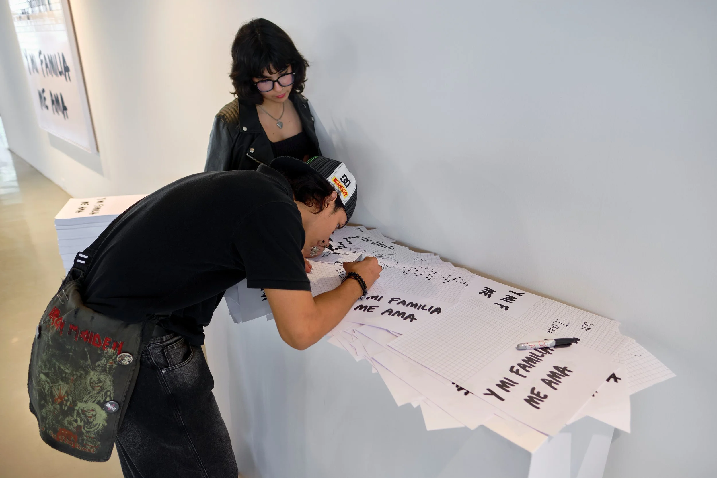 Y mi familia me ama [And My Family Loves Me] draws from a 2001 photo in the Fondo Documental Patlatonalli archive in Guadalajara. A woman holds a sign reading “Soy lesbiana, y mi familia me ama” (I’m a lesbian, and my family loves me) in front of the city’s yellow-tiled cathedral. Although the image reached newspapers, it was censored, stripping it of its radical affirmation. Gülmen now asks: What role does love play in silencing or revealing truth? What are we allowed to say—or suppress—to be loved? Visitors are invited to complete a blank version of the poster, showing what remains hidden.